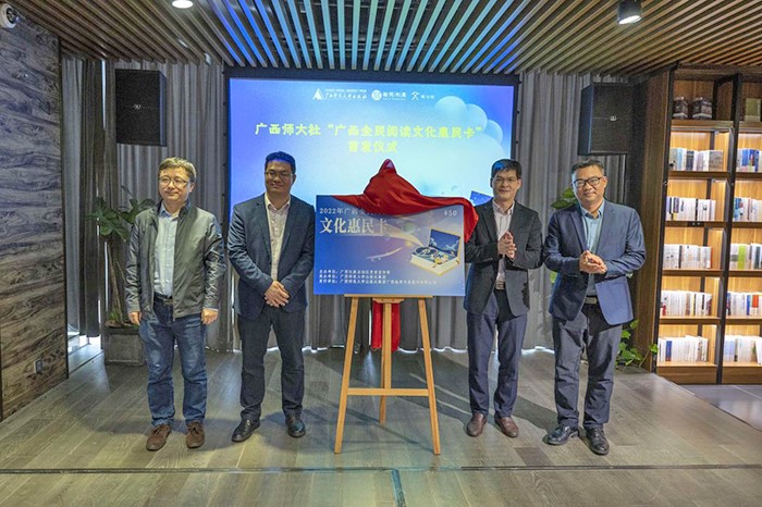 藍廖國(左二)、施東毅(右二)、張俊顯(左一)、容罡(右一)為廣西師大社“廣西全民閱讀文化惠民卡”揭牌(李顯楊 攝)