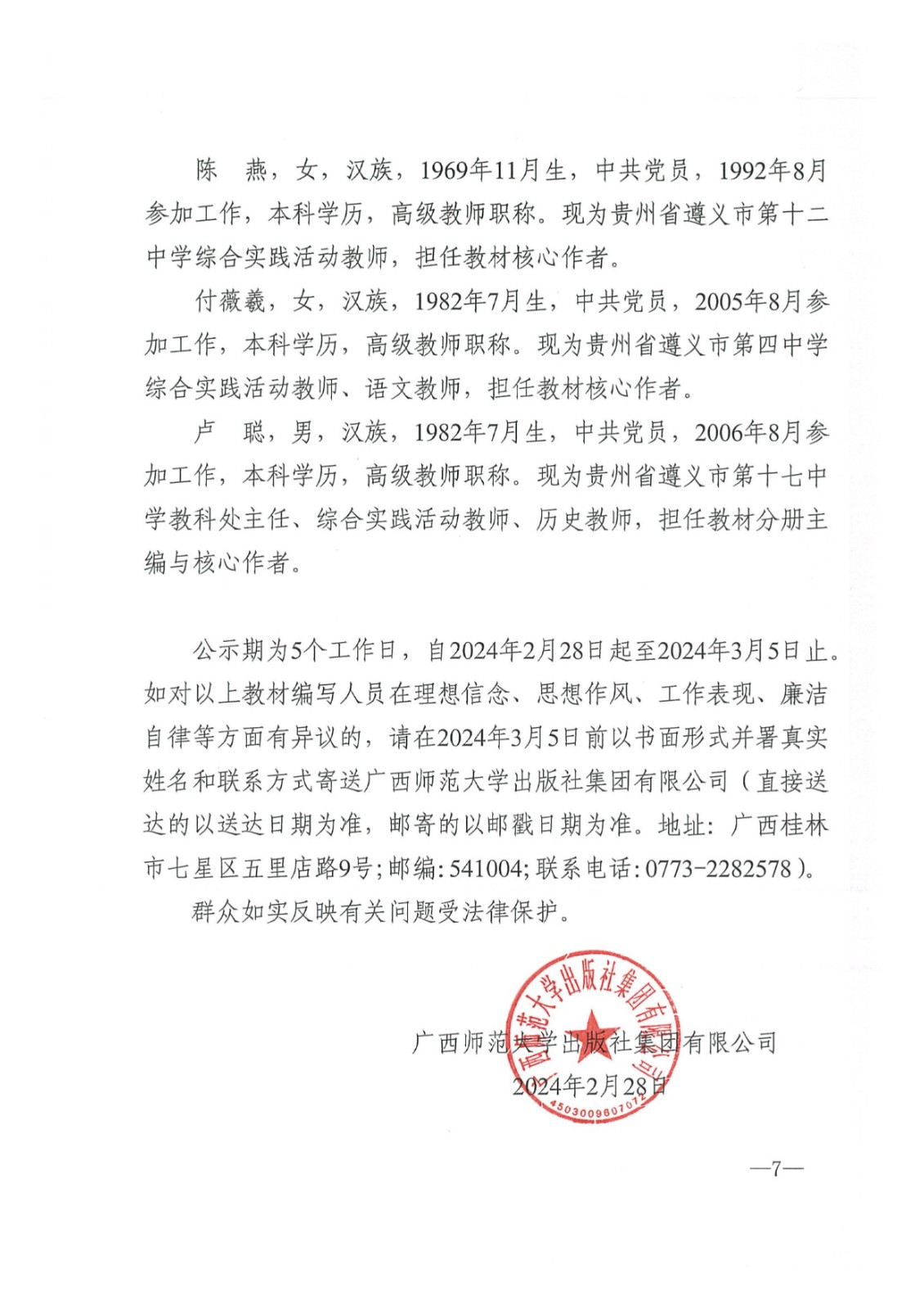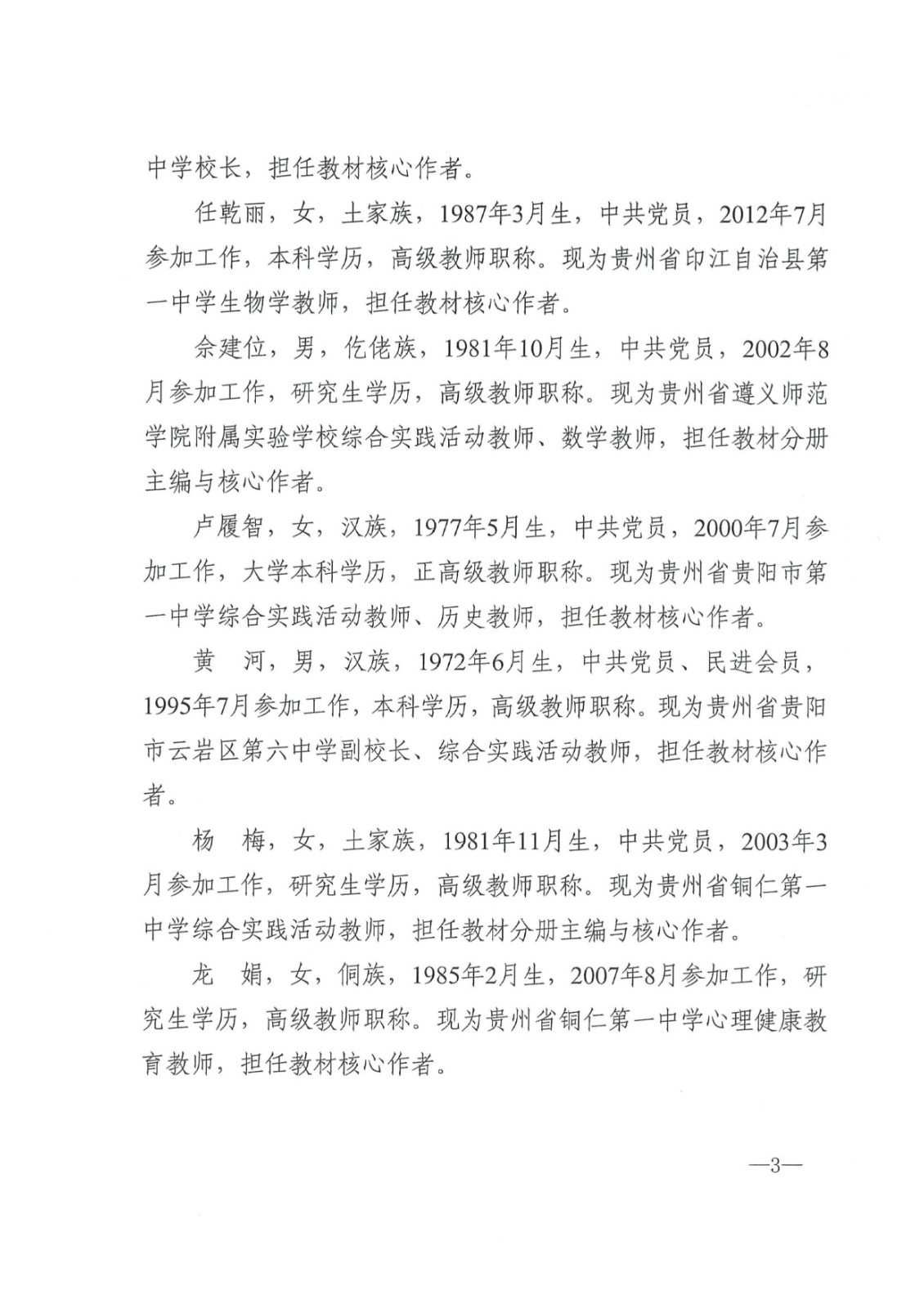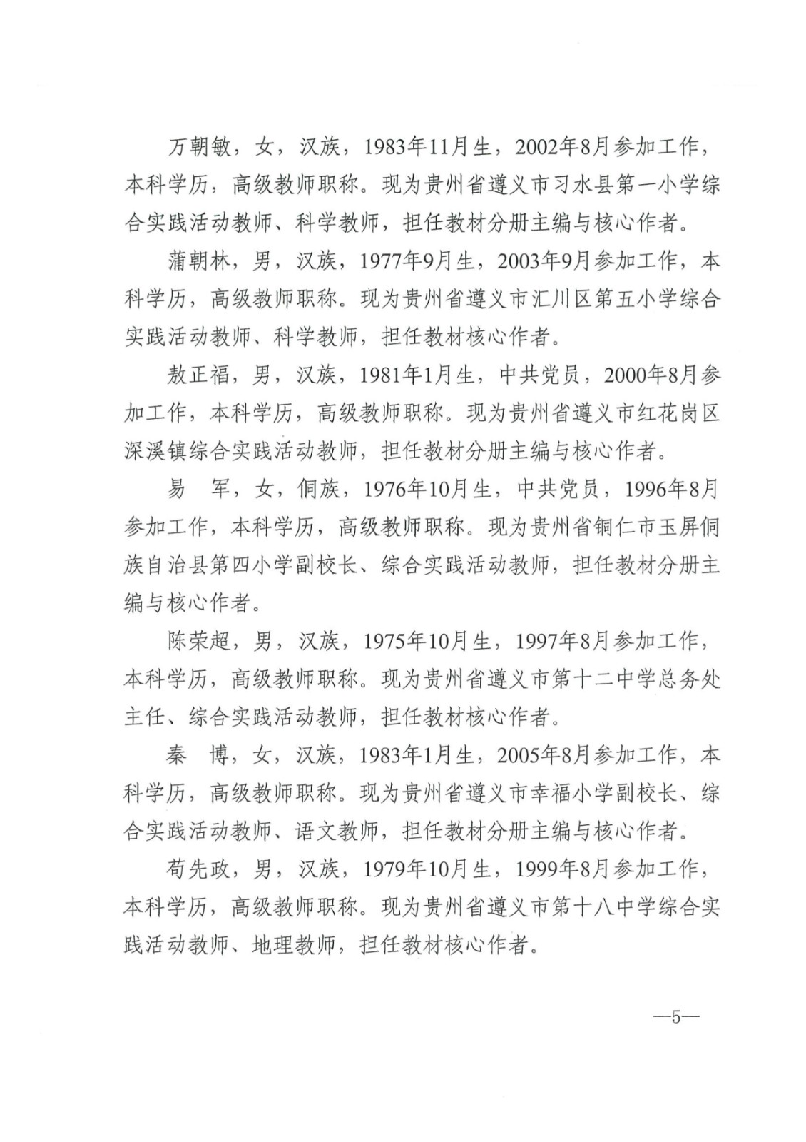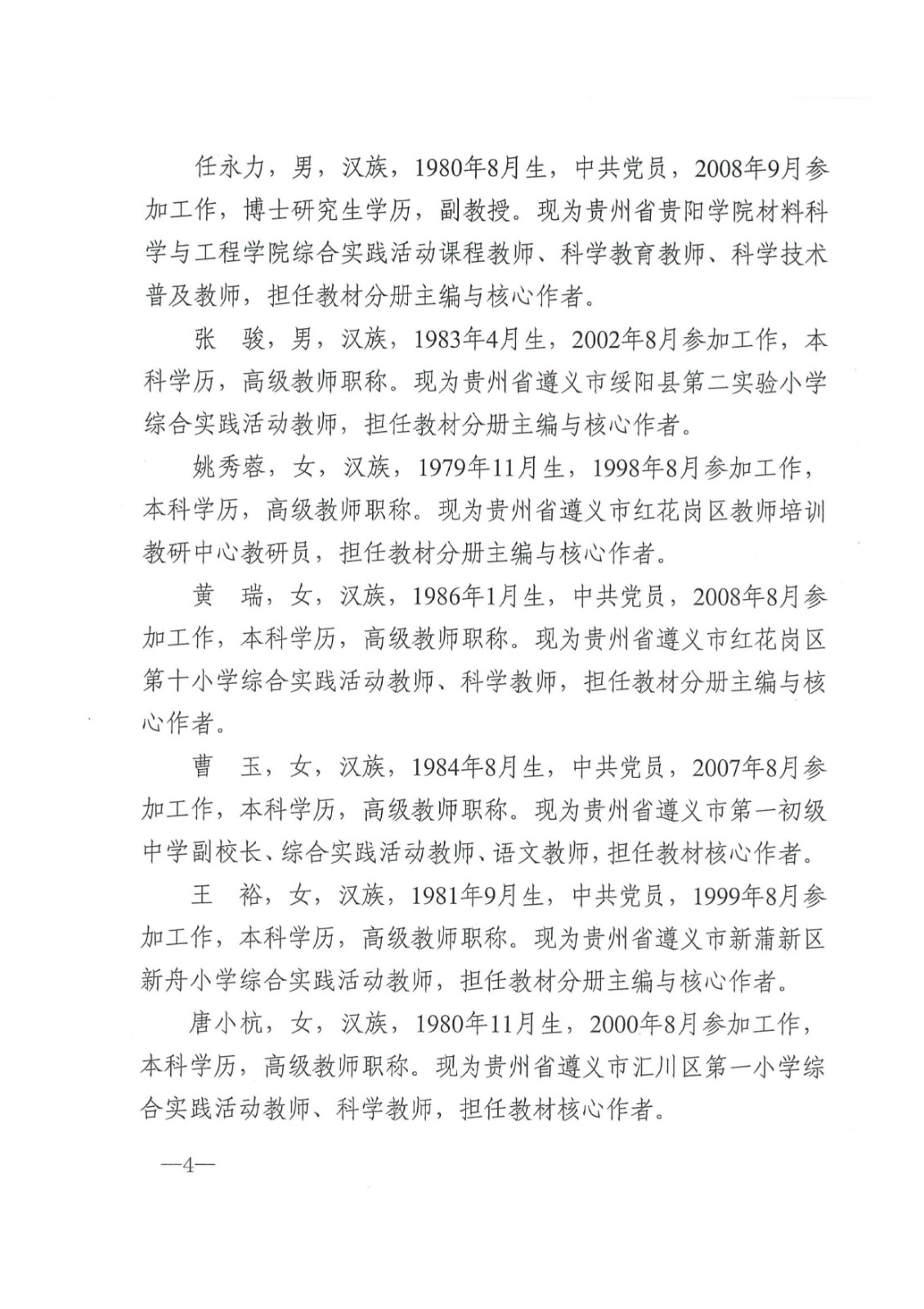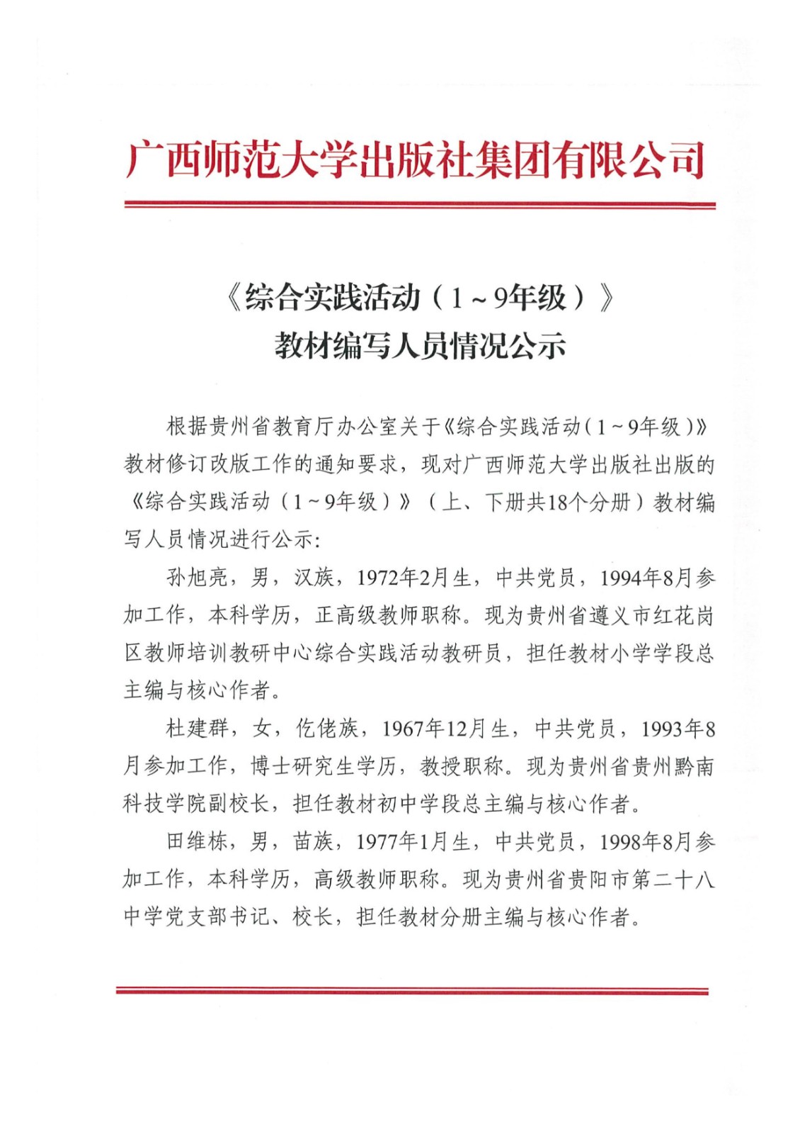 根據貴州省教育廳相關(guān)要求,我集團公司開(kāi)展《綜合實(shí)踐活動(dòng)(1~9年級)》教材修訂改版工作,現將教材編寫(xiě)人員公示如下: